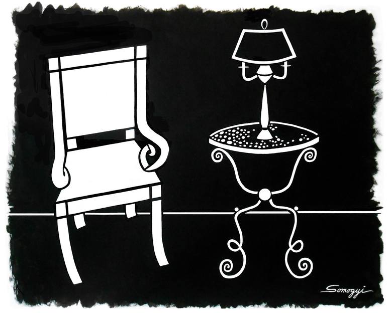 This is an interior scene of a chair and a lamp on a round table, taken directly from the artist’s own bedroom, done in white on a black background. The table was “trash find”. I covered the top in acrylic jewels of all sizes (greens and turquoises in real life) which was then covered with resin. ...