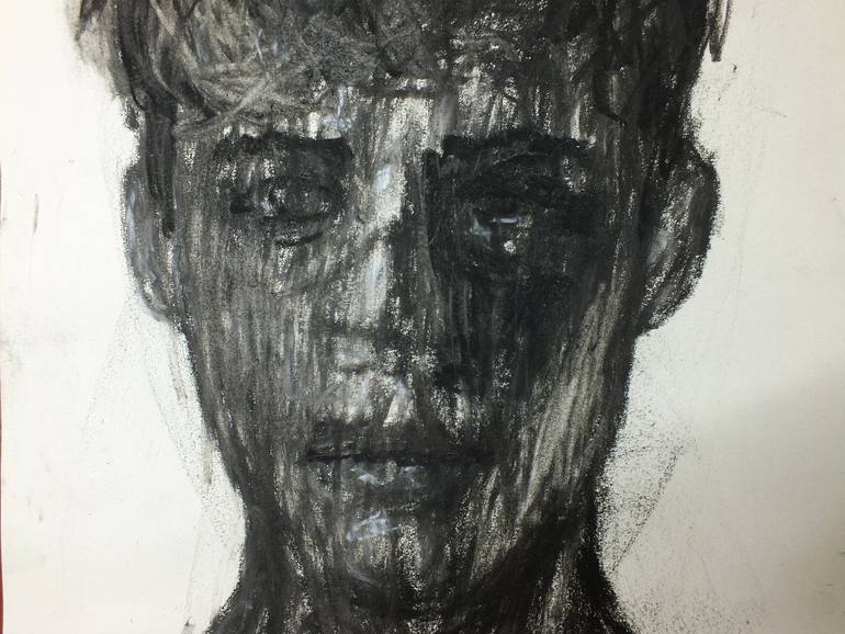 a portrait made with charcoal on paper. a boy in sitting in the dark