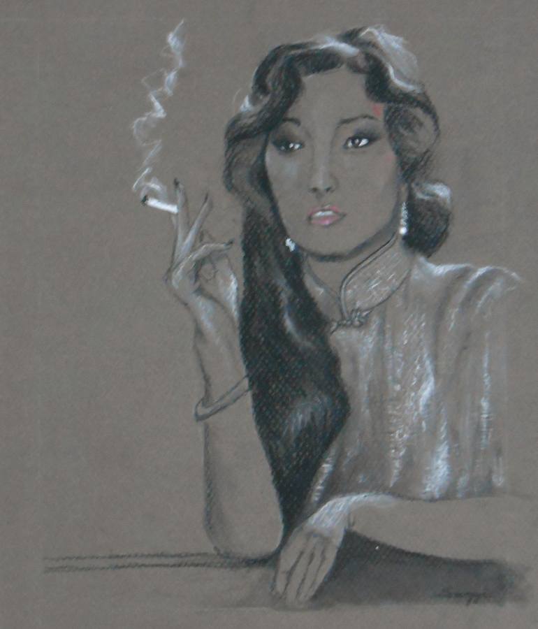 9x12, charcoal & pastel on toned paper. All media/materials used are archival quality. This is a portrait of Chinese actress Gong Li in the 1995 film "Shanghai Triad," set in the criminal underworld of 1930's Shanghai.