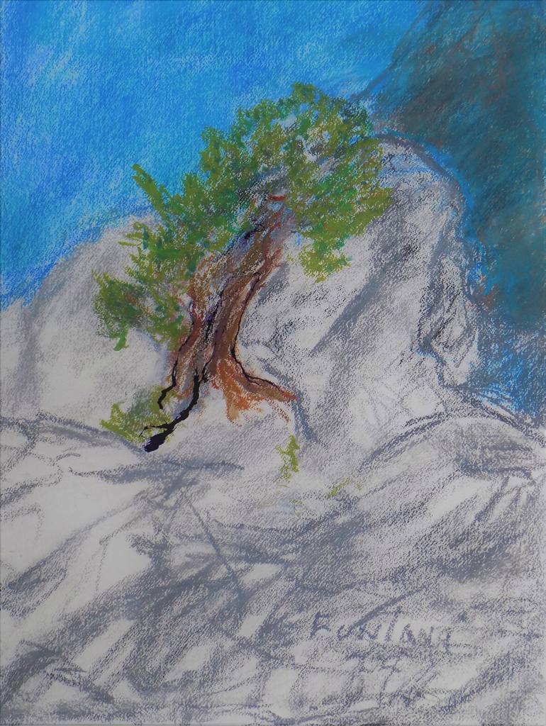 This work was inspired by the solitary beauty of a single ancient tree that has grown like a vine around a glacial erratic. This tree is probably over 1000 years old. With this drawing, I wanted to interpret the outrageously beautiful life form growing out of pretty much nothing but rock!