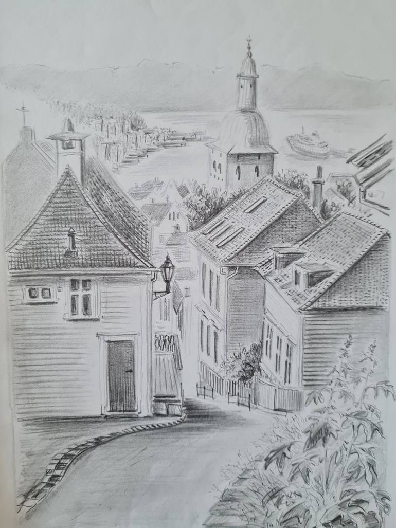 Drawing from Jan Krydsby's calendar of Bergen, Norway. Skivebakken is the steepest street in Bergen.
