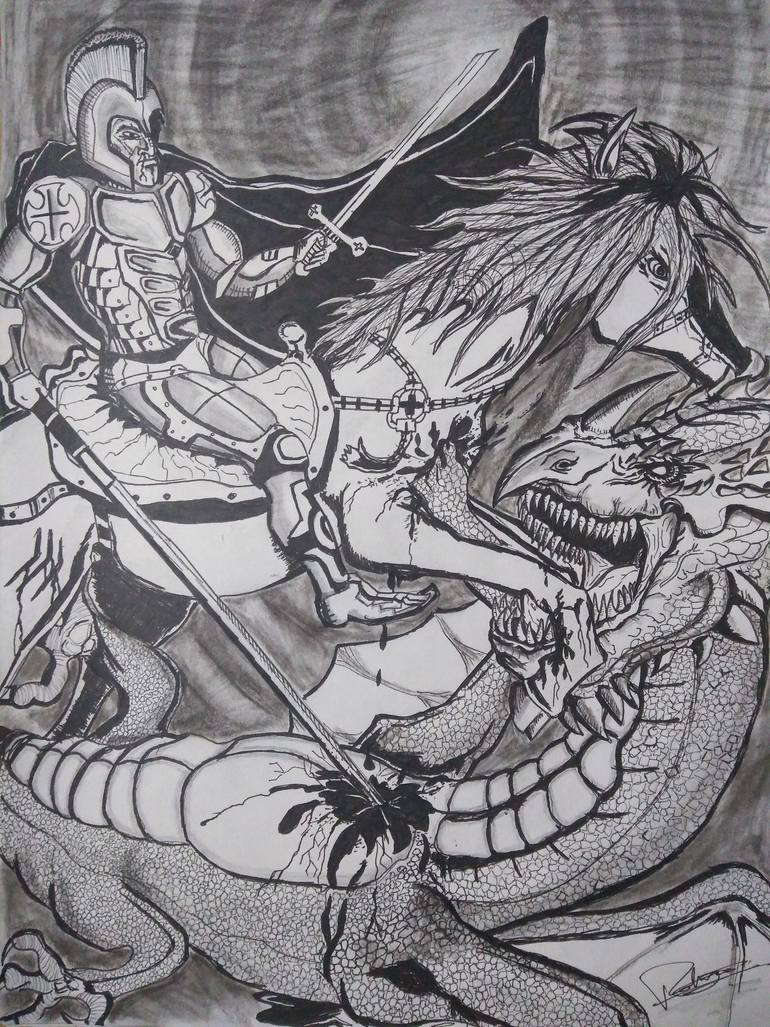 Hi there, this is the glorious depiction of St.George slaying the dragon. Mythological as it is; it had to be a fierce battle with some sacrifices made.
