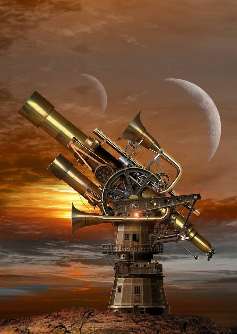 Whimsical Illustration of a retro-style interplanetary observatory telescope