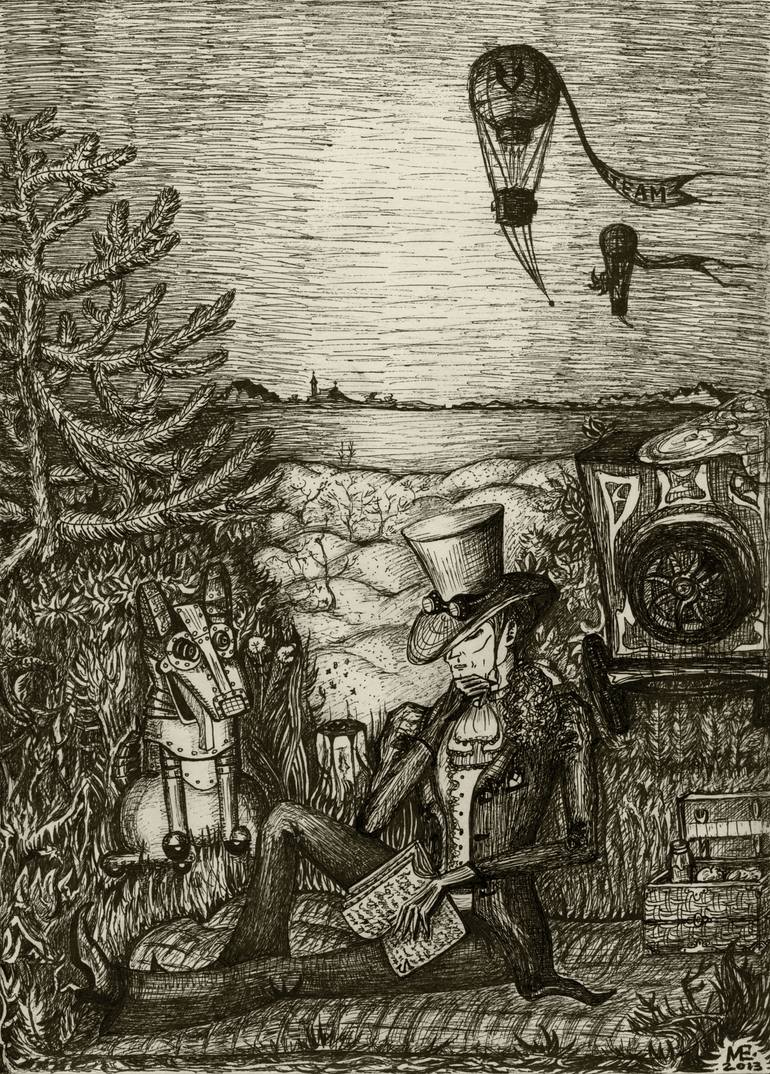 Ever since I can remember I've been feeling that life is an enormous interactive museum of various opportunities and skills and to stick forever near just one of the plethora of exhibits is deadly boring. Therefore after graduating from a liberal arts college in Moscow and studing poetry at the M. Gorky Literature Institute I started working alternately as a writer, editor and designer. My professions walk hand in hand: the list of books that I wrote includes several biographies of painters. I also illustrate my own poems and design covers for books written by my colleagues. A few years ago I was editing a splendid article by one of the authors of our magazine. It was about steampunk. I googled the term - and was truly impressed with what I found. All those colorful pictures of the talented cosplayers and their whimsical characters, elaborated steam mechanisms, entourage interiors and jewelry - they were spectacular! I dug a little deeper discovering steampunk music, movies, books, video-games, etc. It's a huge inspiration! That is how my steampunk (or steampunk-esque) cycle of poems and pictures has begun.