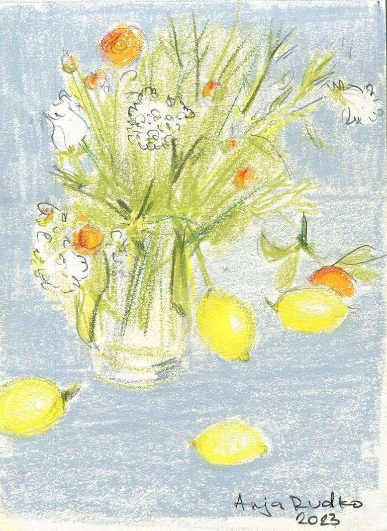 A light blue tone blooms in the figure, like a sky on a clear day. In the center of the image is a vase filled with wildflowers, their bright shades contrast with a delicate background. On the same table are juicy lemons, their yellow brightness adds the dynamics to this picture, like solar glare. ...