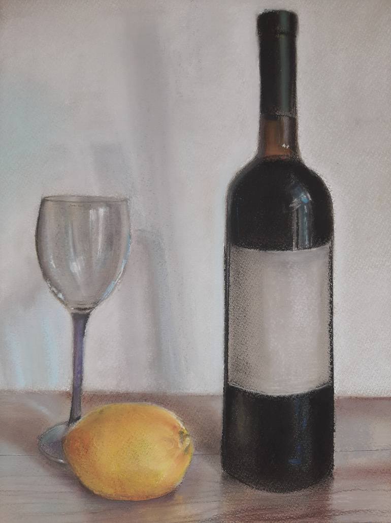 My work is done with dry pastel on Palazzo Premium paper, 200 g/m^2. I depictured a lemon and vine with bottle on the painting.