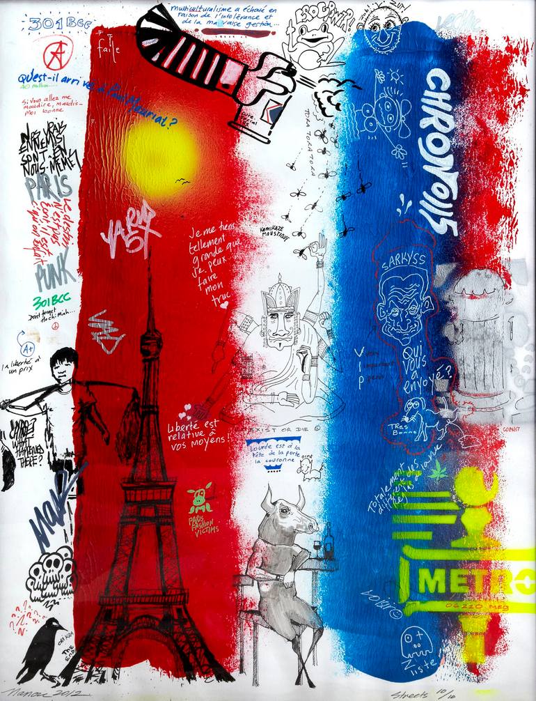 Inspired by street art in Paris. Acrylic, spray-paint, pencil, ink on paper. Limited to ten in the series. This is the only one in the series that is in French. And it is the last in the series.