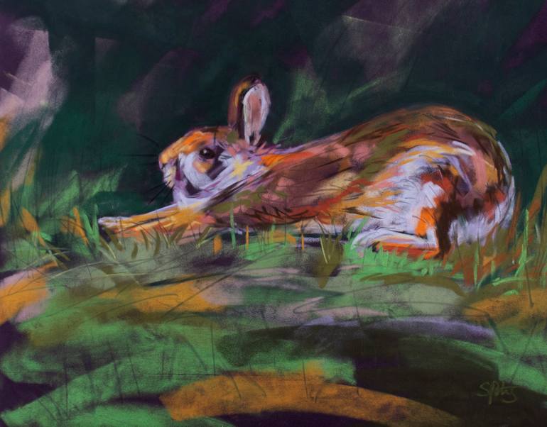 Stretching Bunny is a pastel drawing of a eastern cottontail stretching out after napping all afternoon. These cute rabbits are always on the lookout but sometimes they take a break and just lounge around. When you get lucky enough to see that, it's hard to resist painting them. This bunny is drawn...