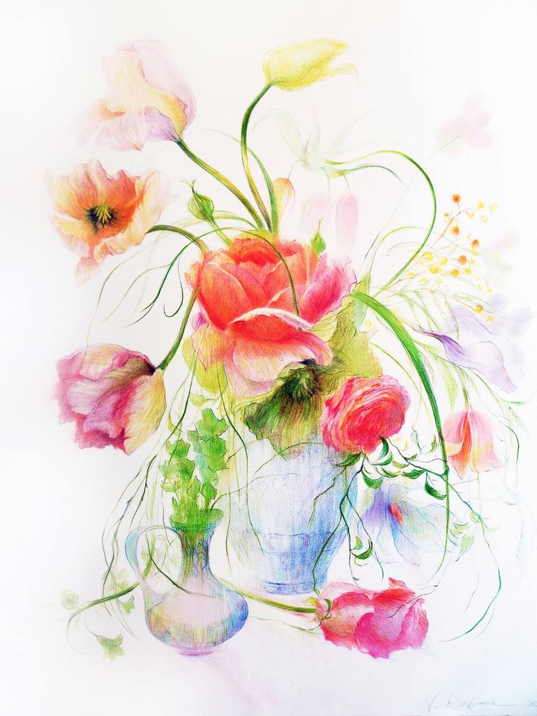 Impressionistic Summer bouquet. Roses,Tulips, Poppies in a Chinese Blue and White Vase. Original , colorful flower still life work. Botanical art. Art work is pencils on a milky white dense fine art paper,has no frame , signed by the artist. Recommendations from the artist: Best is ...