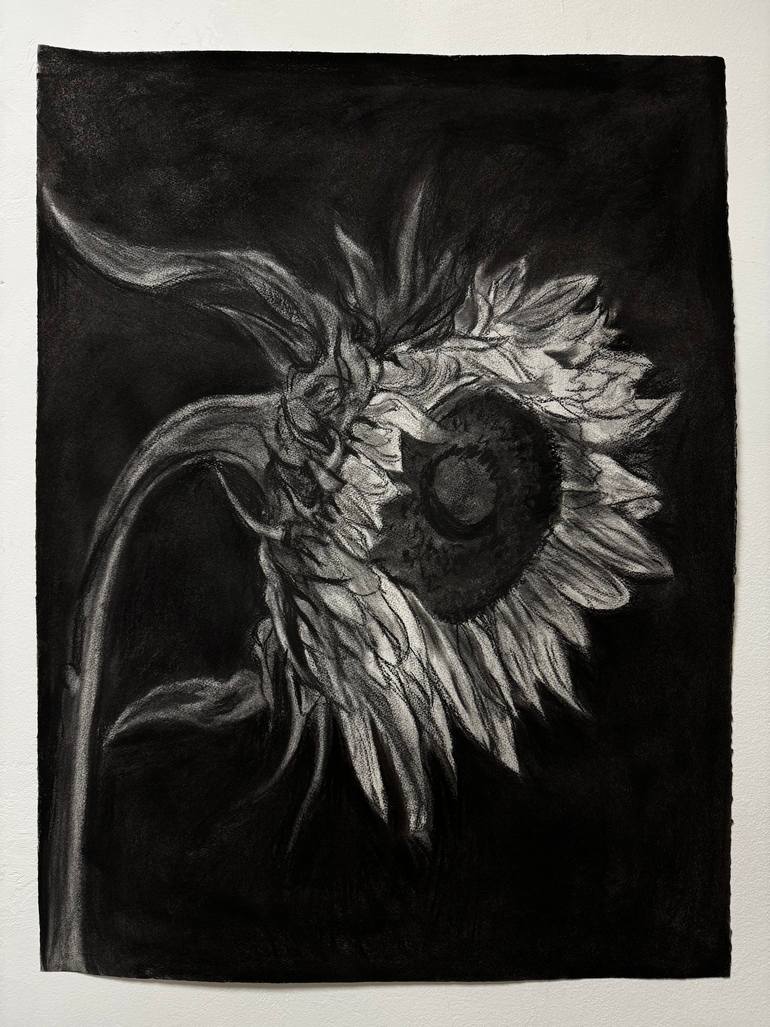 This image is an exploration of a sunflower in charcoal. I did a series of sunflower paintings after visiting the Van Gough exhibition at the National Gallery in London. This is one of the preliminary drawings.