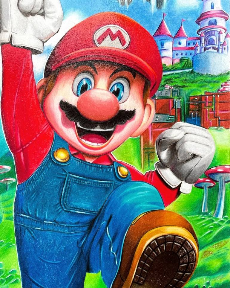 Super Mario, hyperrealistic representation made by coloured pencils.