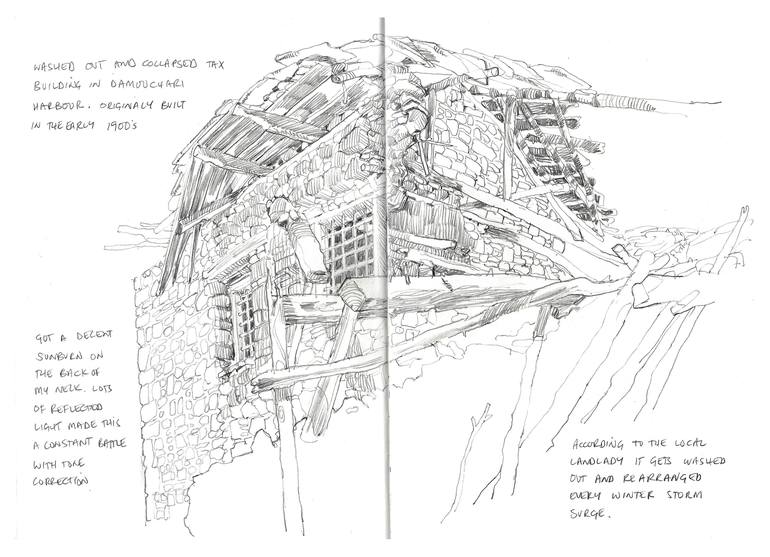 Sketch of the 100 year old tax/duty harbor building in Damouchari village in Pelion in Greece. Very challenging sketch sitting on a big rock in the harbor.
