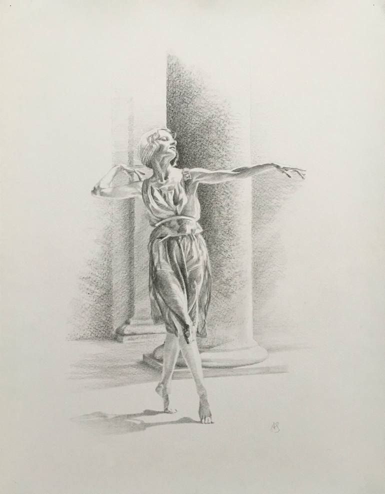 Female dancer in sunlit classical setting. Graphite drawing on Fabriano Academia paper. The paper size of this piece is slightly larger than the photograph you see here. This drawing is fixed and fairly smudge proof. For shipping it will be covered with a protective sheet and carefully rolled in...
