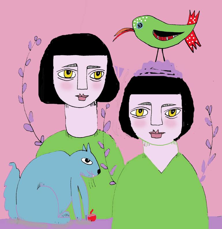 It's a whimsical drawing of twins on a spring day surrounded by their pets a blue squirrel and a squawking red-tailed green bird. It's the usual assortment of pets in a whimsical world.