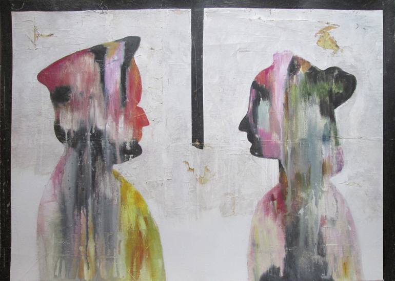 Oil, ink & acrylic on paper. Needs frame. I create this image along with another one with the same drawing but with few variations, "A Florentine couple I" Based on a famous painting from the Italian Renaissance, this couple represents a turbulent, complicate love, only sustained by decadence an...