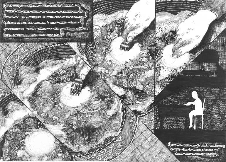 This the second page of a series of illustrations I did on some of my dreams. In this dream, there's an exquisite egg-recipe by an old countryside aunt that becomes a portal through which the dreamer can poke his wife in the back with a fork, to take revenge on some nasty behavior she had years an...