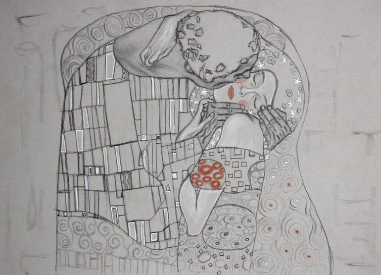 Replica (42x30 cm) of a detail from the painting "The kiss" by Gustav Klimt made with charcoal and white charcoal on gray toned paper