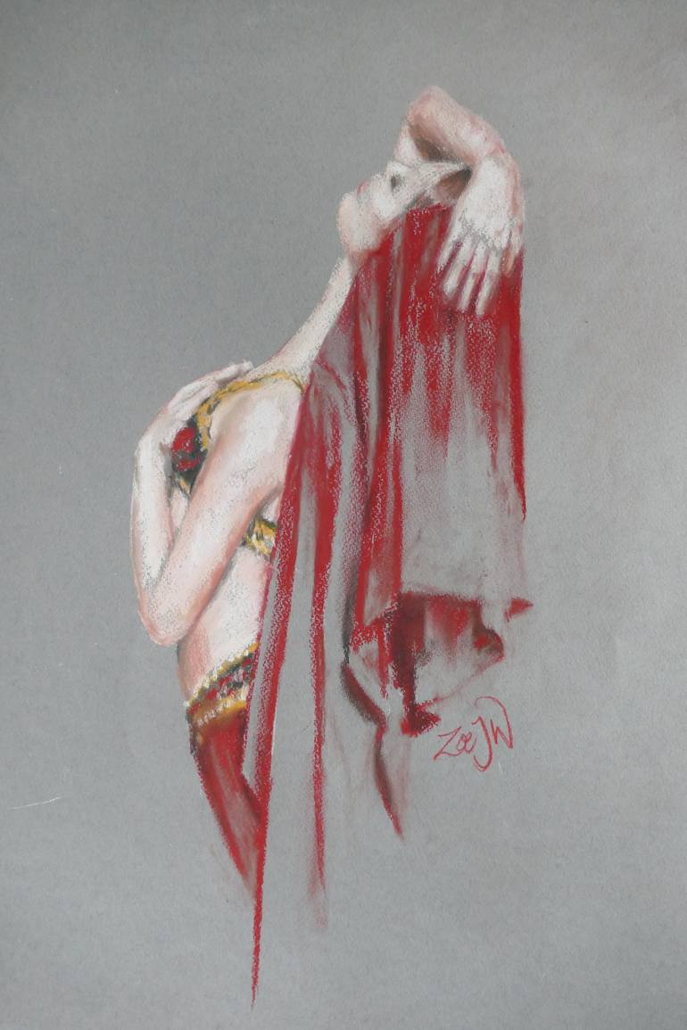 Drawn in pastel on storm grey paper, "Though Lovers Be Lost Love Shall Not" captures a poignant scene from La Bayadere. The artist has depicted Evgenia Obraztsova dancing in the role of Nikiya, the ballet's tragic temple dancer, in a moment that embodies lost love. The striking flash of red chiffon ...