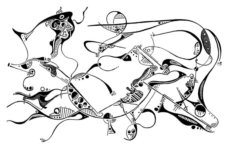 This drawing explores the psychological effect of pareidolia, the reason people enjoy searching for images in the abstract forms of clouds. Through the flowing abstractions, faces and images of animals emerge at the intersection of elements, much as the proverbial "smiley" exists at the intersection...