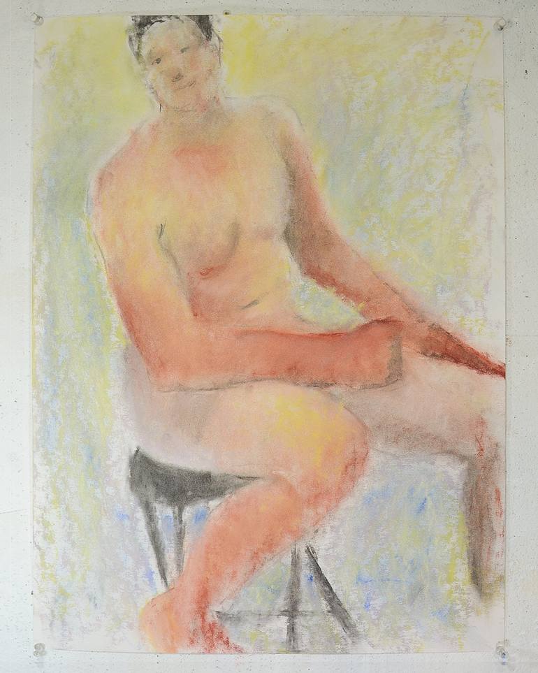 Drawing from model at my weekly drawing session, using charcoal and pastel, etc. The artist's personal contest: capture the vision of figure and express the materials, the space; the drawings some how elicit an emotive feeling.