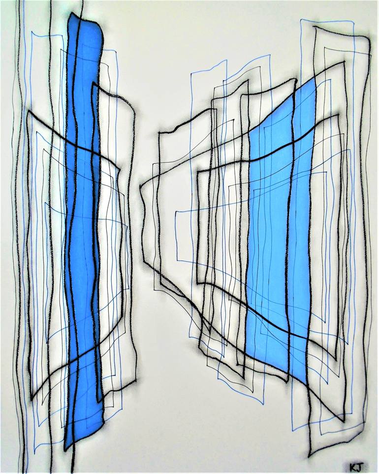 Minimalist composition inspired by the city; overlaid linear expression with cool blues. Fixed with professional fixative and rolled between acid-free tissue paper.