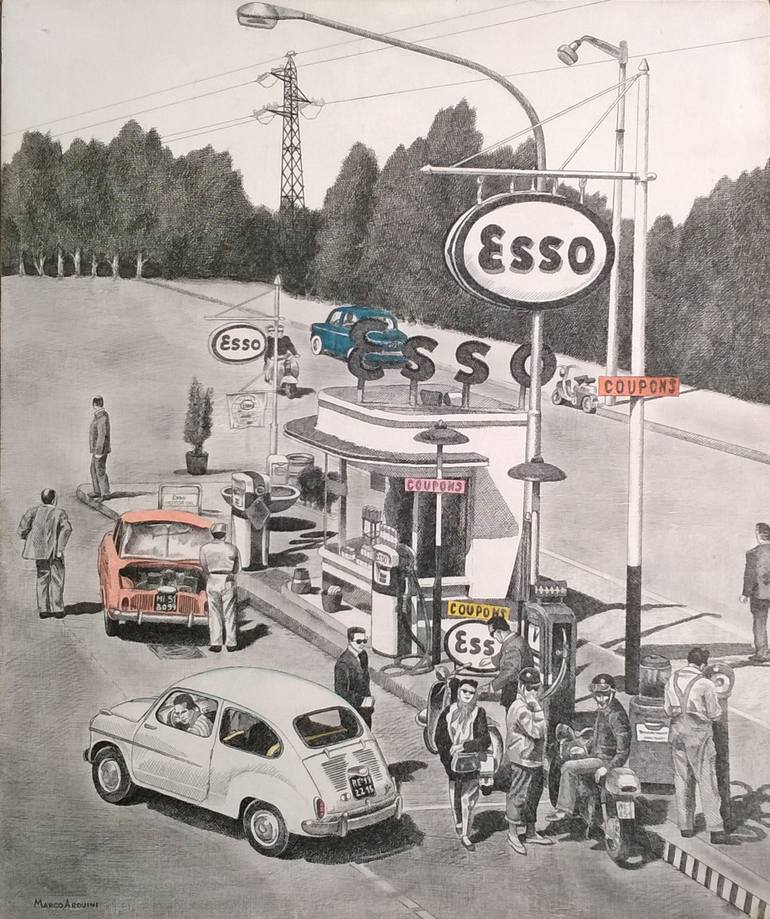 Opera con molti particolari di una giornata di movimento a milano, sosta al distributore di benzina pronti a ripartire per destinazioni varie. usata molto la scala dei grigi con particolari colorati per riempire i punti visivi su tutta l'opera.