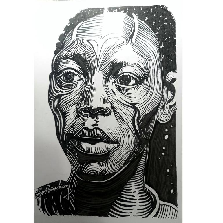 This portrait of a woman is rendered in a striking black-and-white style that combines realism with the aesthetic of traditional woodcut prints. Her features are natural and expressive, while the carved, engraved textures lend the work a tactile, graphic quality. The interplay of light and shadow em...