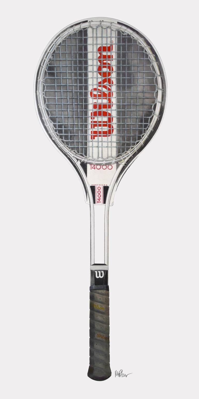 This Mike Pitzer, pop-realism artwork offers a striking and meticulously rendered portrayal of a vintage Wilson T4000 tennis racquet. Drawn in colored pencil and graphite on paper, the piece captures the racquet’s classic steel frame and tightly woven strings with remarkable precision. The vibrant r...