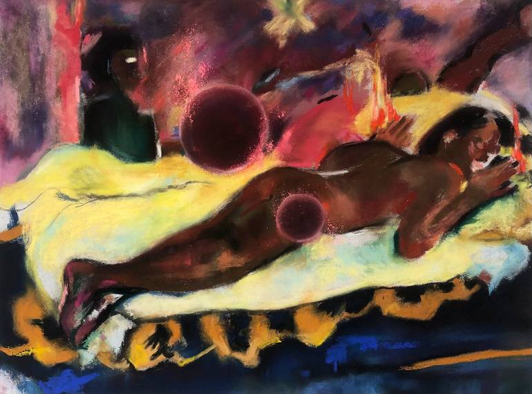 Created after the original by Paul Gauguin. In my vision, I imagined that the child was about to be saved by the figure towards the back of the image, as opposed to being exploited by Gauguin. I've removed the fear from her face that he was so pleased to have included in the original. The fire is t...