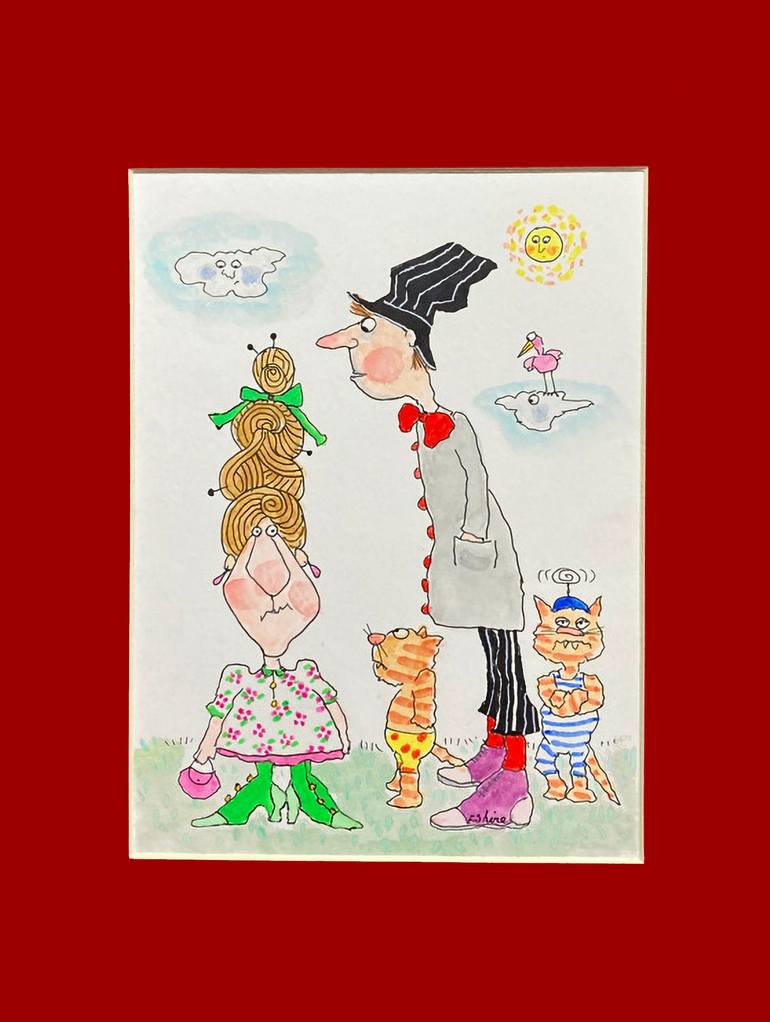 One of a series of odd characters and animals in funny situations. I enjoy creating stories within one picture. It is a change from accompanying a text, which I have often done as a children's book author/illustrator. Here, Mr. (make up a name) is fascinated by Wanda's magnificent hairdo. One cat an...