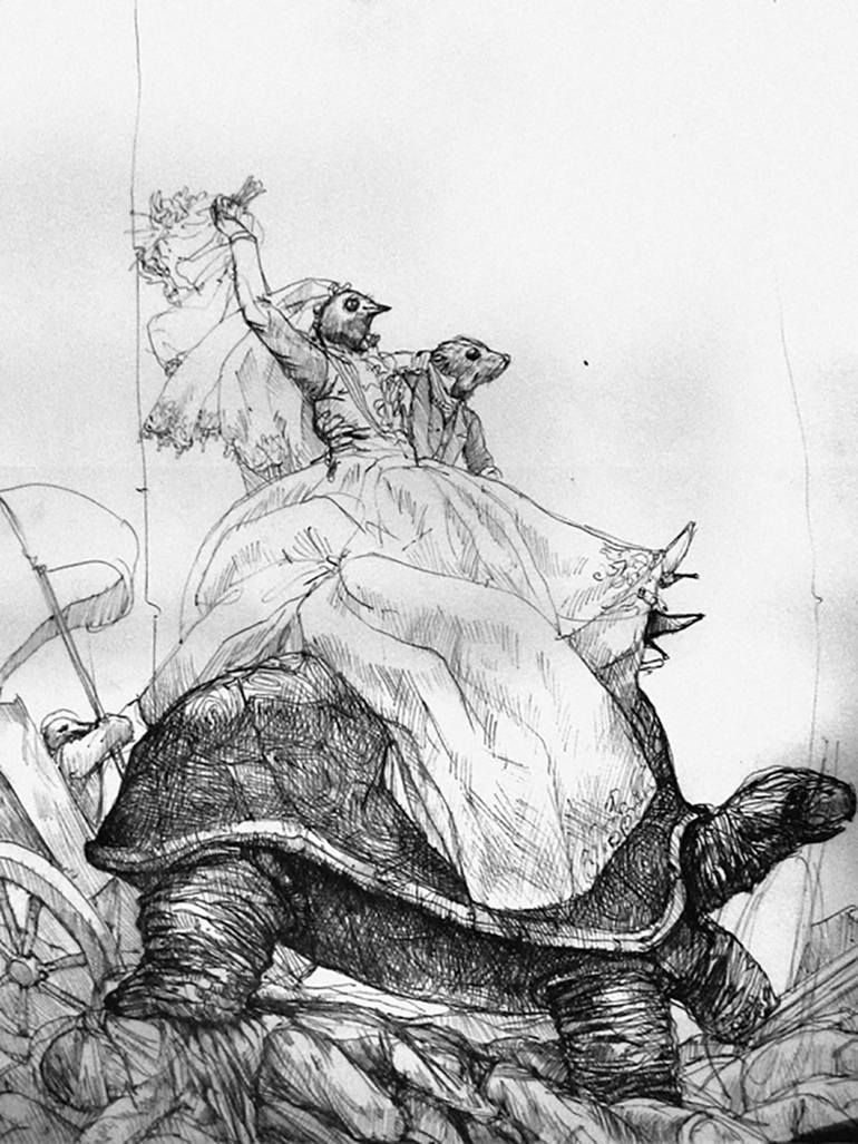 In an zoomorphic setting, animals are depicting happiness in a wedding, riding a turtle, slowly