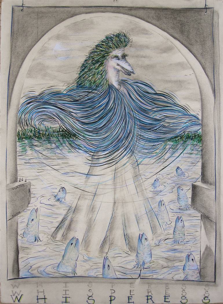 This fanciful watercolor depicts a mythical figure who communicates with all the fish in the sea. this is loosely based on native american mythology and a good dose of humor and satire.
