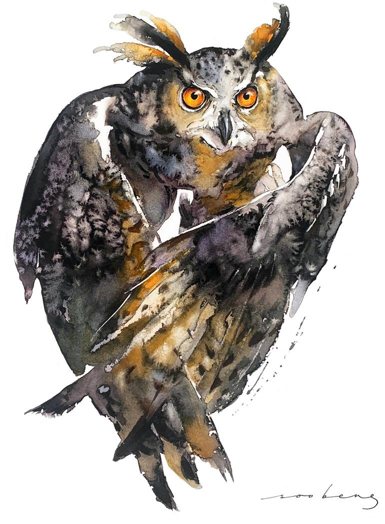 With wings drawn close, the owl embodies stillness, exuding a sense of calm as it surveys its surroundings with piercing eyes. Ink and watercolour on Saunders Waterford 300gsm smooth cotton paper. Photo courtesy from johnbishop67.