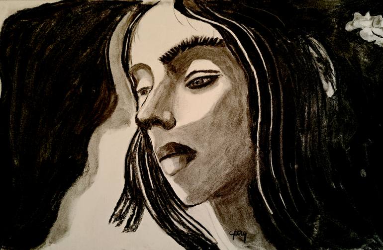 This drawing began its life as an Italian actress, first as a painting and then appearance modified here as charcoal drawing. This yields a high contrast that leaps from your wall. The foreshortening is extreme. Highlights in the hair pop off the paper.