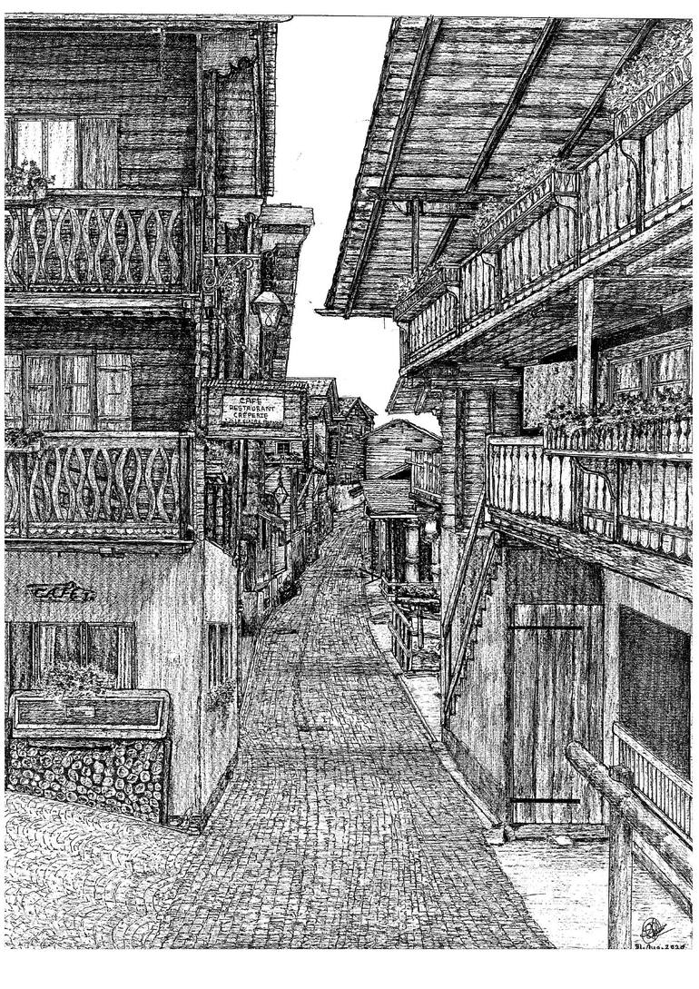 These are some of the wooden houses from The Alpine village Grimentz Switzerland. It is done with Pigma Micron pen and Ink pen.