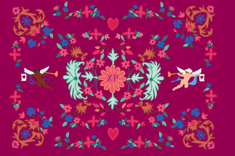 “XP/ Chi - Ro” hand-illustrated poster, 45 cm x 64 cm, high-quality PDF 45 cm x 64 cm, magenta XP/ Chi - Ro are the Greek initials for Christ, often depicted on Greek Orthodox icons; while the floral design is taken from an Arabic carpet. The angels with trumpets are sounding the message of love, a...