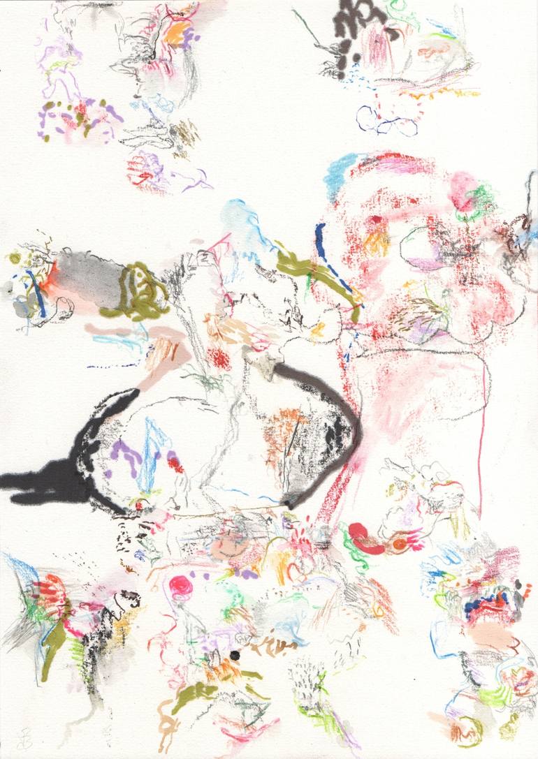 My paintings and drawings suggest the nature of intimacy, community, transition, circumstance, process and progression. They depict life/forms, disparate and transient, that form societies constantly shifting and changing, combining to create fleeting moments of recognisable subjects and meaning. That which animates (spacial relationships, rhythm) is as important as that which is animated (subject) The materials I use have often been gathered in the same vein. I come across some old dried-up tubes of gouache, museumboard cut-offs out of a skip from the picture framer down the street, pencils in varied states of use, etc., and rejuvenate them to create these works.