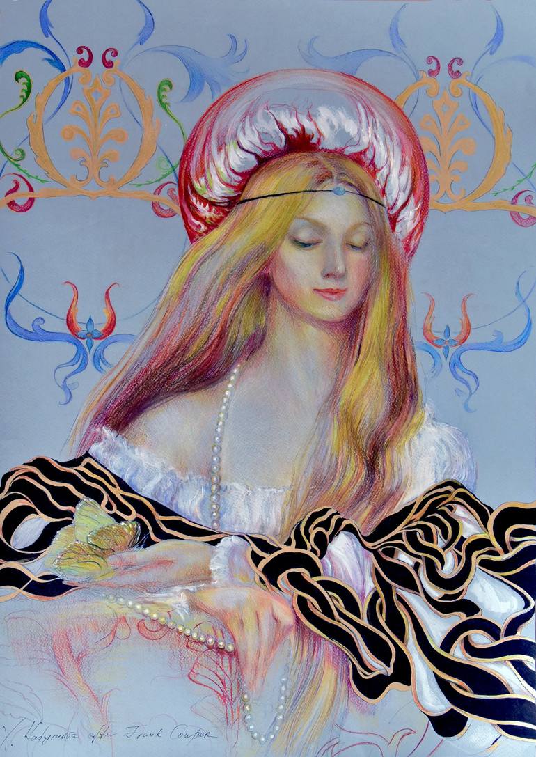 Large woman portrait. Figurative art. Romantic contemporary art inspired by Italian Renaissance , Pre-Raphaelites and based on Frank Cowper's ''Vanity " whose subject matter, decorative elements relate it to the works of art of '' Second generation of Pre-Raphaelites''. Despite possible portr...