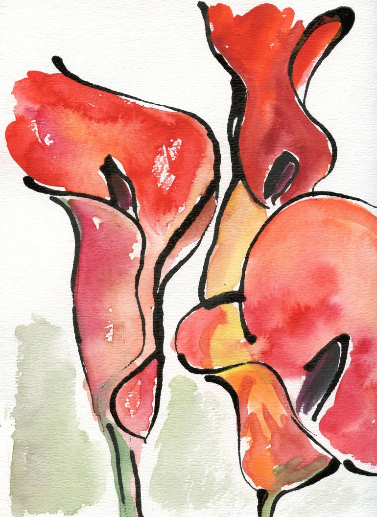 This is an ink and watercolor sketch of vibrant Calla Lilies, titled "Zantedeschia". The artist captured the beauty of the blooming flowers, which transformed the front yard into a spectacle. The artwork combines the precision of ink with the fluid washes of watercolor on paper. This medium sized d...