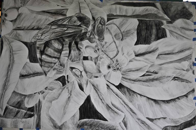 Drawing of a bee among the flowers. Charcoal-pencil-graphite technique on Guarro paper It is sent rolled up in tube