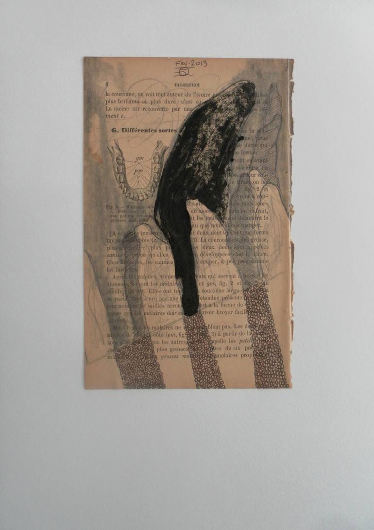 dessin au stylo bille noir, vernis à ongle noir et crayon sur page d'un ouvrage d'histoire naturelle de 1900 format 10,8x17,2 cm marouflé sur feuille canson blanc format 20,1x30,3 cm