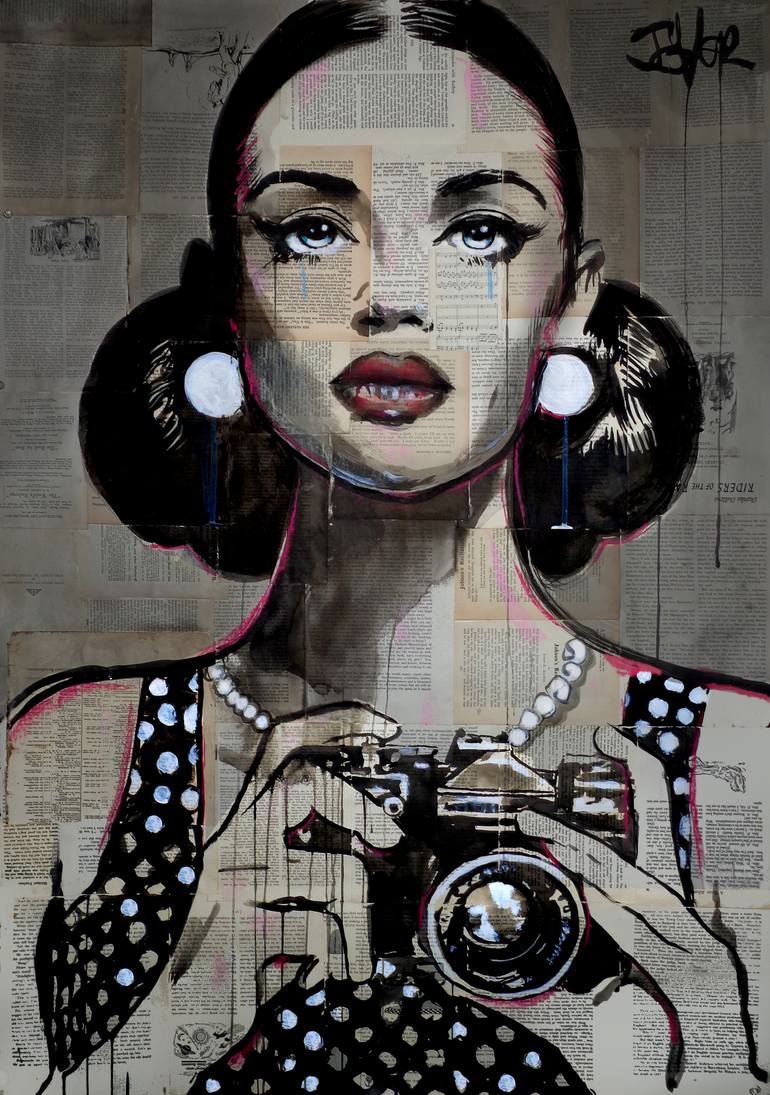 this work forms part of the camera girl series created in various mediums on book pages, vintage paper, white paper and on canvas over the past 10 years, a popular series loved by collectors across the globe, over 100 works make up this ongoing series. all artworks are sprayed with museum quality ar...