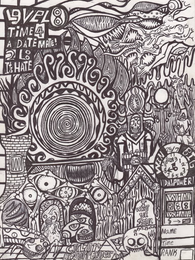 level 8 nv set by Louie.v.t. draw with a heavy hand ,thick and deep lines like no other dark and kinda scary but easy to relate it's level 8 time 4 a date mate 2 late it's hate