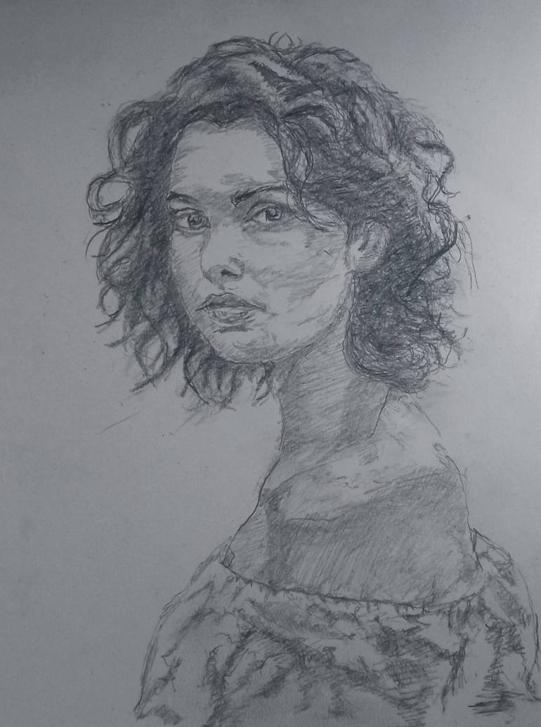 The sketch depicts a woman with a focused gaze and a slightly pensive expression. She has a full head of curly hair that frames her face. Her hair is darker than her skin tone, creating a contrast that emphasizes her facial features. The woman has a straight nose, full lips, and a strong jawline. He...