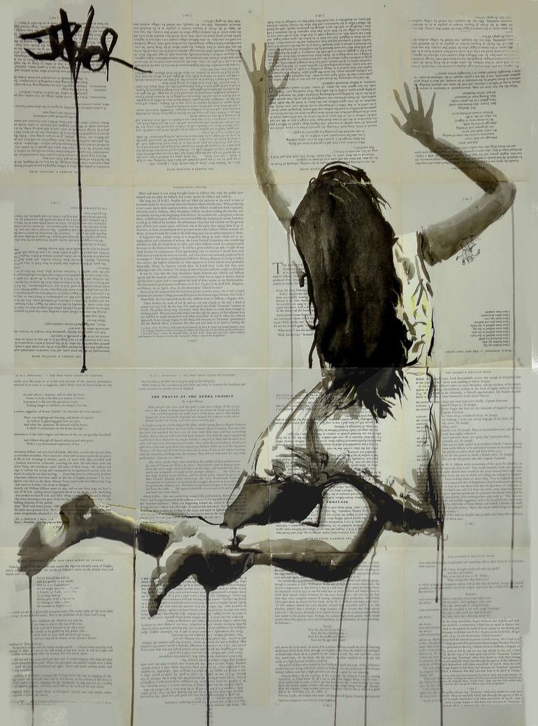 Drawing: Ink on Paper. this work forms part of an ongoing series of works on the subject of falling, jumping, movement showing emotion , this particular work was created in Japanese sumi ink and indian ink on vintage book pages adhered together to create one sheet ready for framing.. a popular seri...