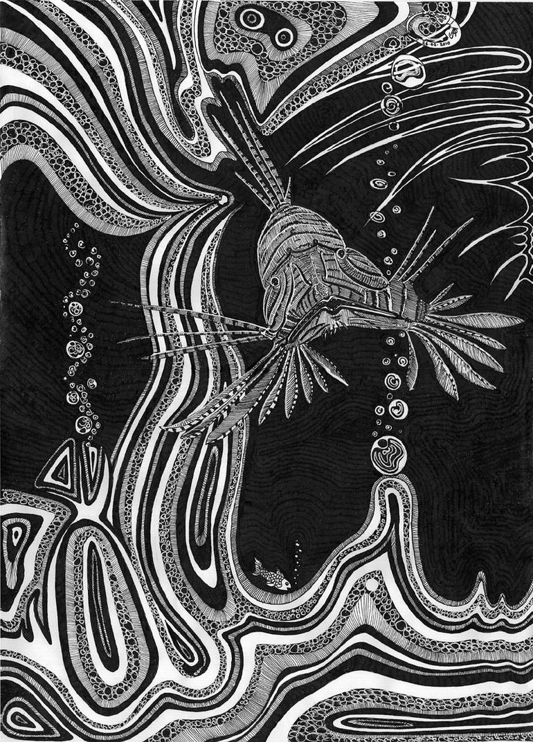 fine line ink drawing,of my idea of a lion fish,modern contemporary rendition.