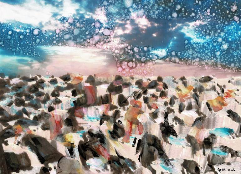 “Shattered Dreams in the Refugee Camp” poignantly grapples with the refugee experience in an abstract manner. The crowd of people morphs into an abstract entity where motion and stillness intersect, and bubbles burst above them. This evocative piece features Western ink and Chinese ink on yupo paper...
