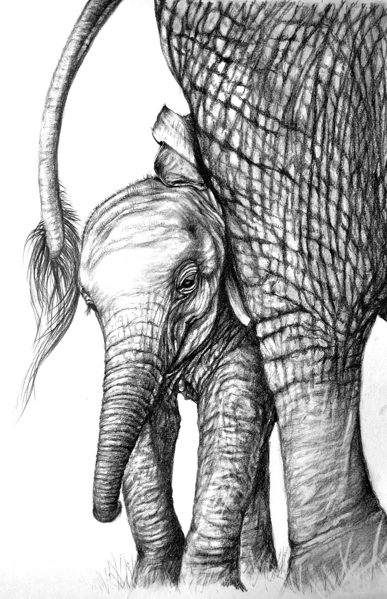 I love to do realistic graphite drawings of wild animals especially by portraying tender moments like this cute and vulnerable baby elephant hiding behind his mother...
