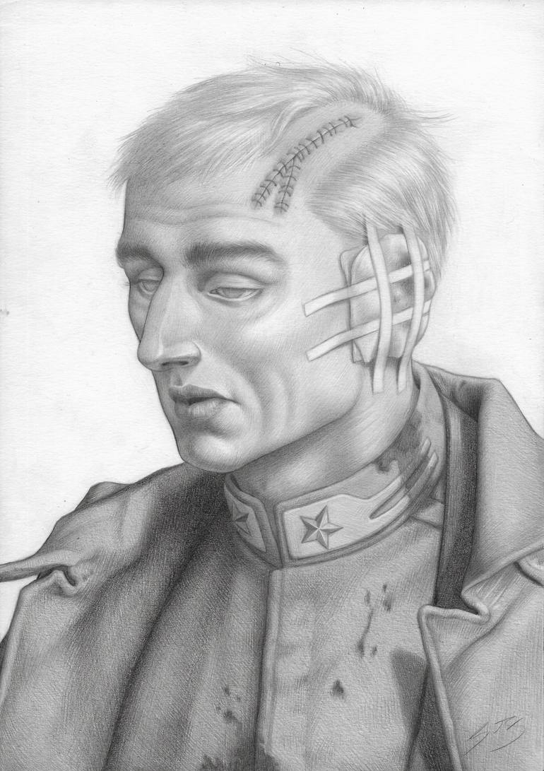 Half-length portrait of a soldier of the First World War in a state of shock, reference used for the uniform but not for the face, which was made from imagination