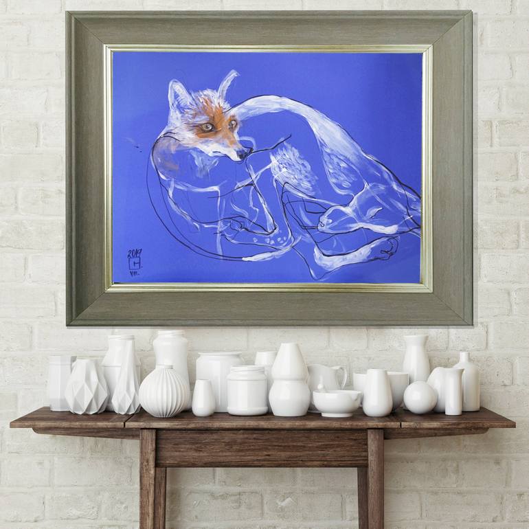 "Her beautiful mixed-media paintings find the middle ground between art and illustration, providing the viewer with endless enjoyment and interest. In many of the artworks, Olga keeps her colours nicely muted and calmly toned, to create a soothing effect that beautifully emphasises the naturalistic elements of her work. She pays an incredible amount of attention to the anatomical details of the animals she represents, ensuring that each creature is skillfully and accurately captured. Her work has a peaceful feel to it, created by the wonderful subject matter and glorious palette. In this collection, fishes swim happily, horses smile or watch the world go by and a group of deer scatter in the falling landscape. Each image is perfectly coordinated with the ideal colour to bring out the glitter in the sky or the twinkle of an eye. Every detail is highlighted and shown in its best light, each toothy smile or playful glance. The creatures are the stars, but the painter brings out their best. In some of my favourite paintings, a group of birds watch the flood, safe in the knowledge that they are free from harm. The swimming blues cascade together and contrast stunningly with the dashes of red and yellow. The form of the birds in the foreground opposes the twittering masses flying away. In other works, hares are caught out in acid-coloured washes that turn them from cute animals into blazing pop-art icons. Horses share a whisper and talk amongst themselves about issues that humans couldn't possibly understand. In Gal's world, birds and rabbits are present at political gatherings and cows and cats know secrets and communicate in their own special language. I think these delightful works would make a great gift for an animal lover, or would equally be at home in a café or restaurant anywhere in the world. With a lightness of touch that makes them so special, their quirky energy would light up any room and provide a buyer with years of happiness."